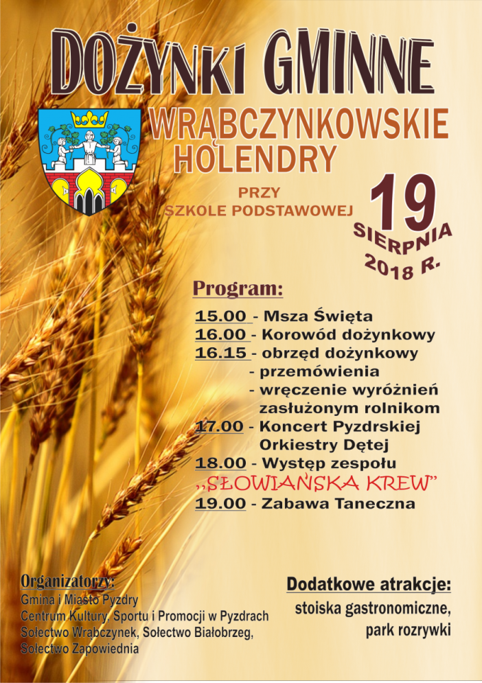 Serdecznie zapraszamy na doroczne święto plonów, które w tym roku odbędzie się 19 sierpnia we Wrąbczynkowskich Holendrach na placu przy Szkole Podstawow