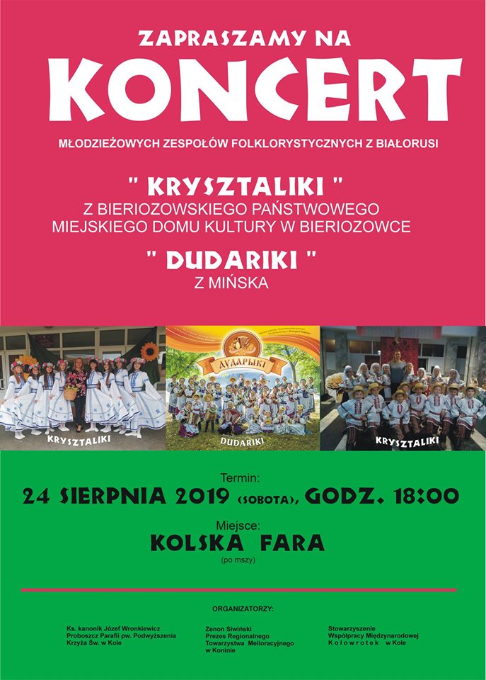 W najbliższą sobotę (24 sierpnia) w naszym kościele parafialnym odbędzie się koncert młodzieżowych zespołów folklorystycznych z Białorusi. Rozpoczęcie po Mszy św. wieczornej, tj. około godz. 18.30