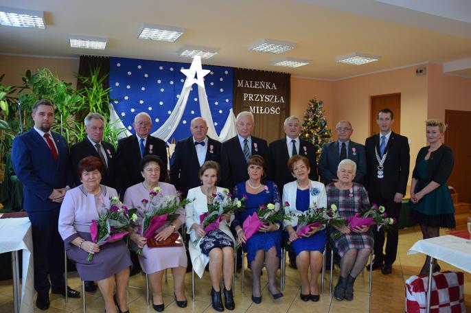 Pary, które przeżyły razem 50 lat nagradzane są specjalnym medalem przyznawanym przez Prezydenta Rzeczypospolitej Polskiej. Medal ma kształt sześcioramiennej gwiazdy, w środku której jaśnieje napis „Za długoletnie pożycie małżeńskie”, oraz widnieją dwie srebrzyste róże. „Na żaden medal nie pracuje się tak długo jak na ten- 50 lat”- podkreślała kierownik USC, p. Agnieszka Kowalska. Uroczystego aktu dekoracji medalami nadanymi przez Prezydenta Rzeczypospolitej Polskiej dokonali Wójt Gminy Jakub Gwit wraz z przewodniczącym Rady Gminy Filipem Muszyńskim. Jubilatom wręczono odznaczenia, pamiątkowe dyplomy, upominki oraz kwiaty. Nie zabrakło również symbolicznego toastu oraz tortu. W imieniu jubilatów podziękowania za zaproszenie złożył pan Czesław Dykszak.