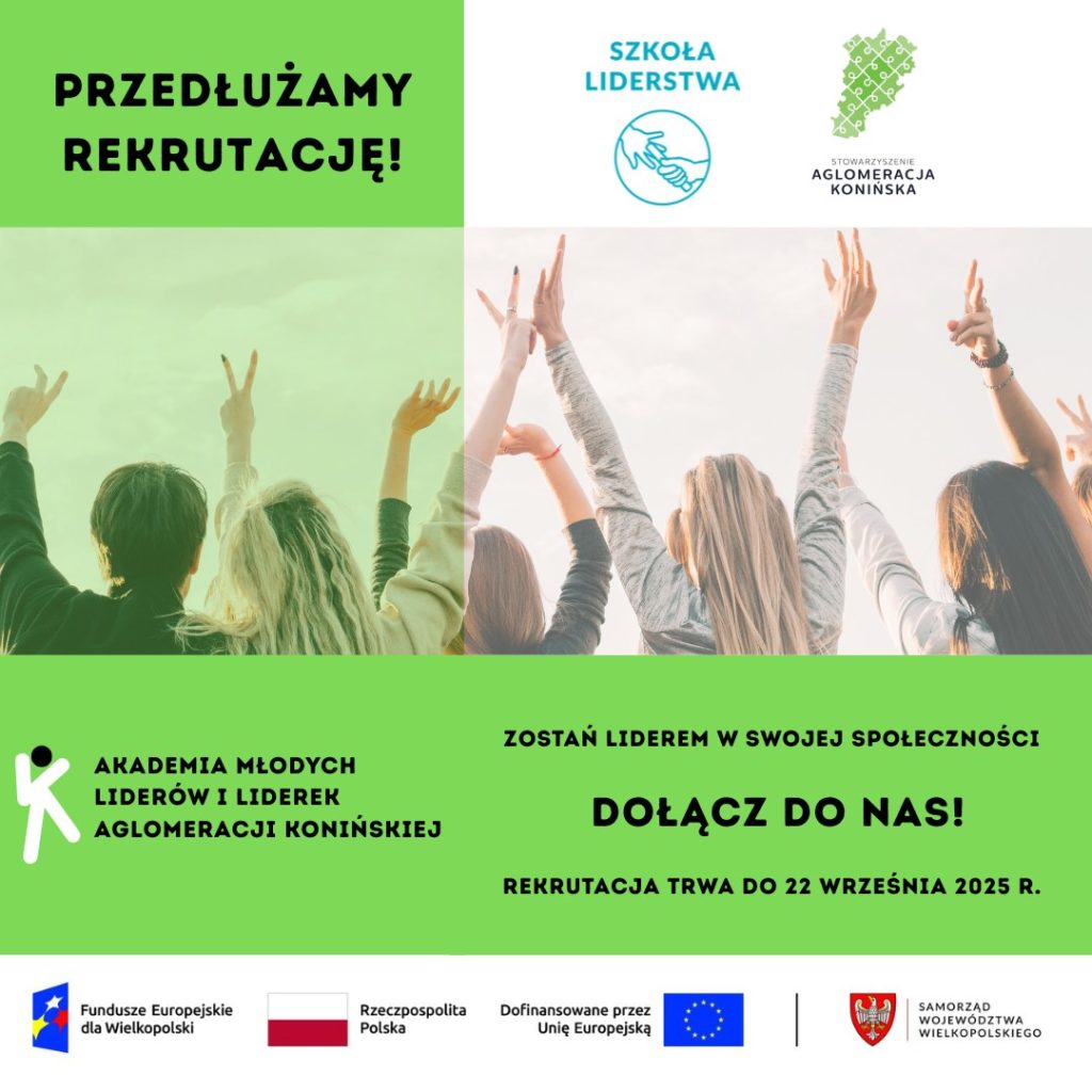 Stowarzyszenie Aglomeracja Konińska poinformowało, że ze względu na duże zainteresowanie projektem „Akademia Młodych Liderów Aglomeracji Konińskiej” rekrutacja została przedłużona do 22 września 2025 roku. To szansa dla młodzieży z regionu, by rozwijać swoje kompetencje liderskie i aktywnie wpływać na życie społeczności lokalnych.