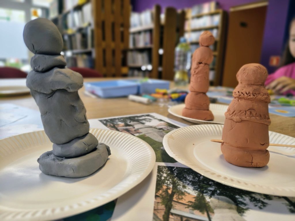 Po powrocie do biblioteki rozpoczęły się zajęcia plastyczne z gliną. Dzieci tworzyły własne miniaturowe słupy drogowe, a także figurki, serduszka, motylki i inne dekoracyjne formy. Każda praca była unikalna – tak jak uczestnicy warsztatów.