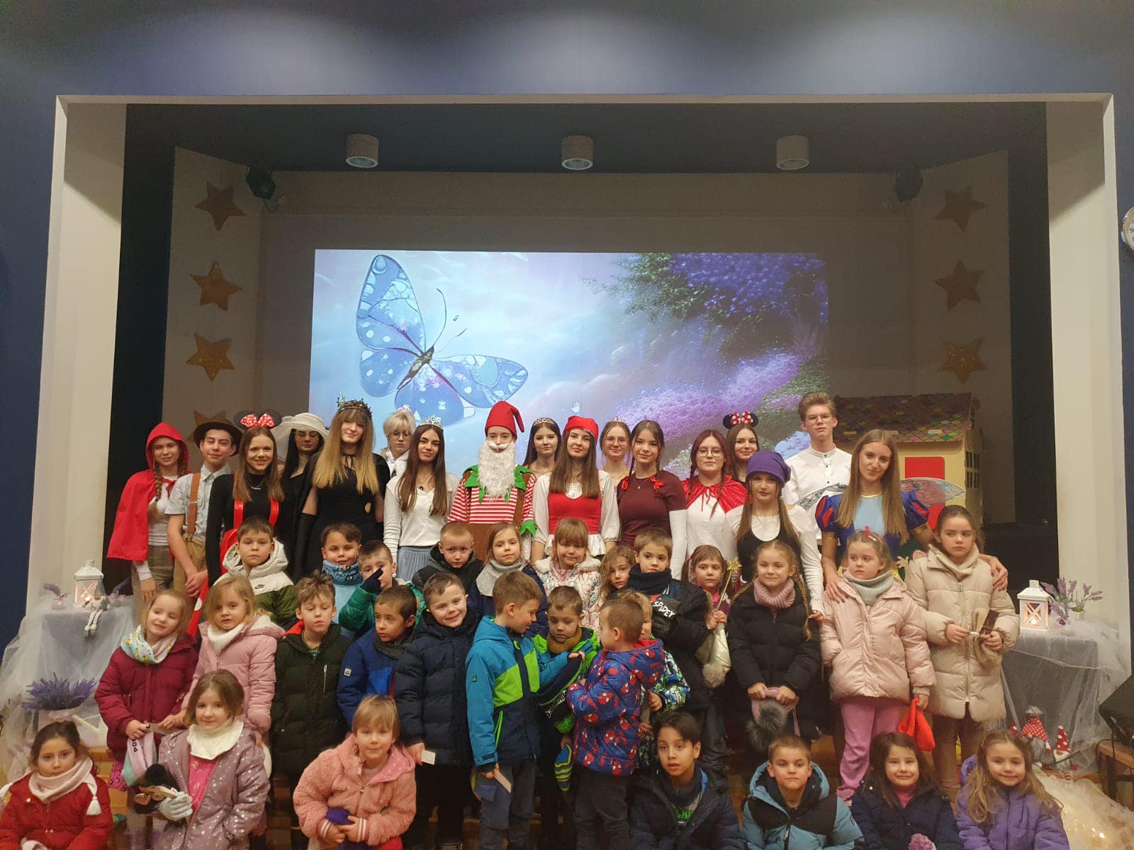 Widowisko wzbogaciły występy wokalne uczennic z klasy 3A, które swoimi piosenkami wprowadziły publiczność w magiczny nastrój. Na scenie pojawiły się postacie takie jak Czerwony Kapturek, Królewna Śnieżka i Jaś i Małgosia w bajkowych, kolorowych strojach, które zachwyciły widzów.