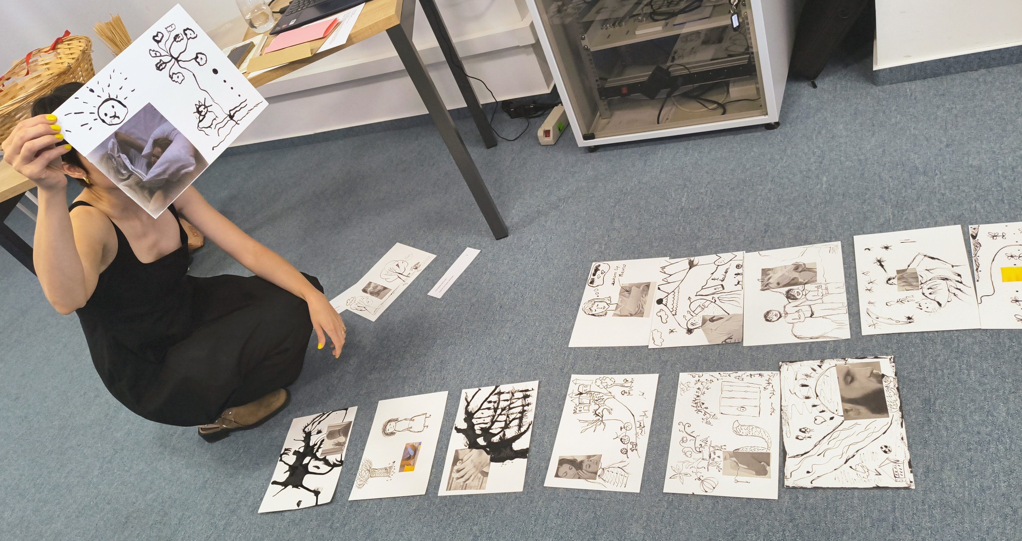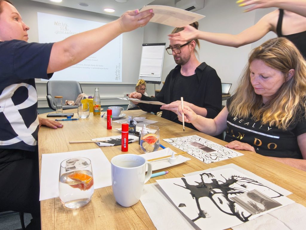 Podczas artystycznych warsztatów uczestnicy mierzyli się z niecodziennym zadaniem: wyrazić wylosowany cytat za pomocą tuszu, patyczków i wycinków z gazet. Efektem wspólnej pracy był komplet autorskich kart do teatrzyku kamishibai – japońskiej formy opowiadania historii z wykorzystaniem ilustracji.