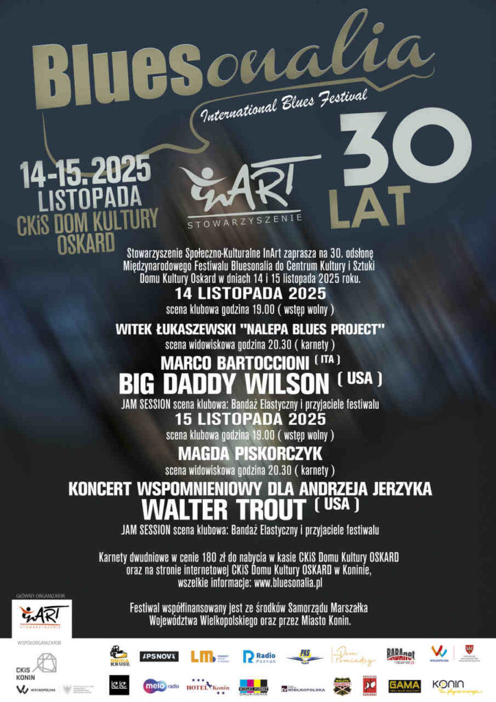 Stowarzyszenie Społeczno-Kulturalne InArt zaprasza na jubileuszową, 30. edycję Międzynarodowego Festiwalu Bluesonalia, która odbędzie się 14 i 15 listopada 2025 roku w Centrum Kultury i Sztuki – Domu Kultury Oskard w Koninie.