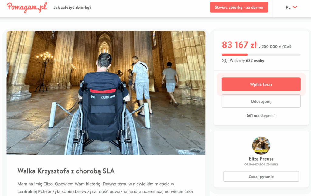 Zebrane środki pozwolą nie tylko na zakup komunikatora do porozumiewania się, czy łóżka i wózka rehabilitacyjnego, ale również na wsparcie Elizy w codziennej opiece nad mężem i rehabilitację, która pozwoli zwiększyć komfort życia Krzysztofa, oraz je wydłużyć. Każde wsparcie pozwoli również utrzymać rodzinę, która aktualnie pozostaje bez środków do życia, co jest niesamowitym stresem, który pogłębia chorobę Krzysztofa.