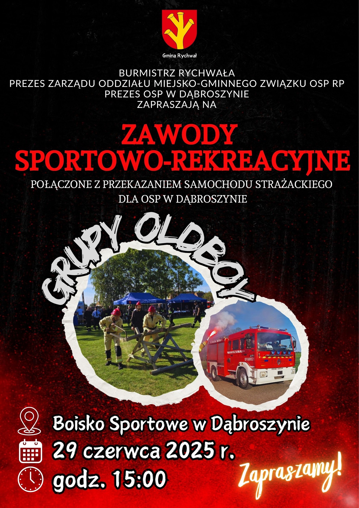 W niedzielę, 29 czerwca 2025 roku o godzinie 15:00 na boisku sportowym w Dąbroszynie odbędą się Zawody Sportowo-Rekreacyjne Grupy Oldboy, połączone z uroczystym przekazaniem samochodu strażackiego dla tamtejszej jednostki Ochotniczej Straży Pożarnej.
