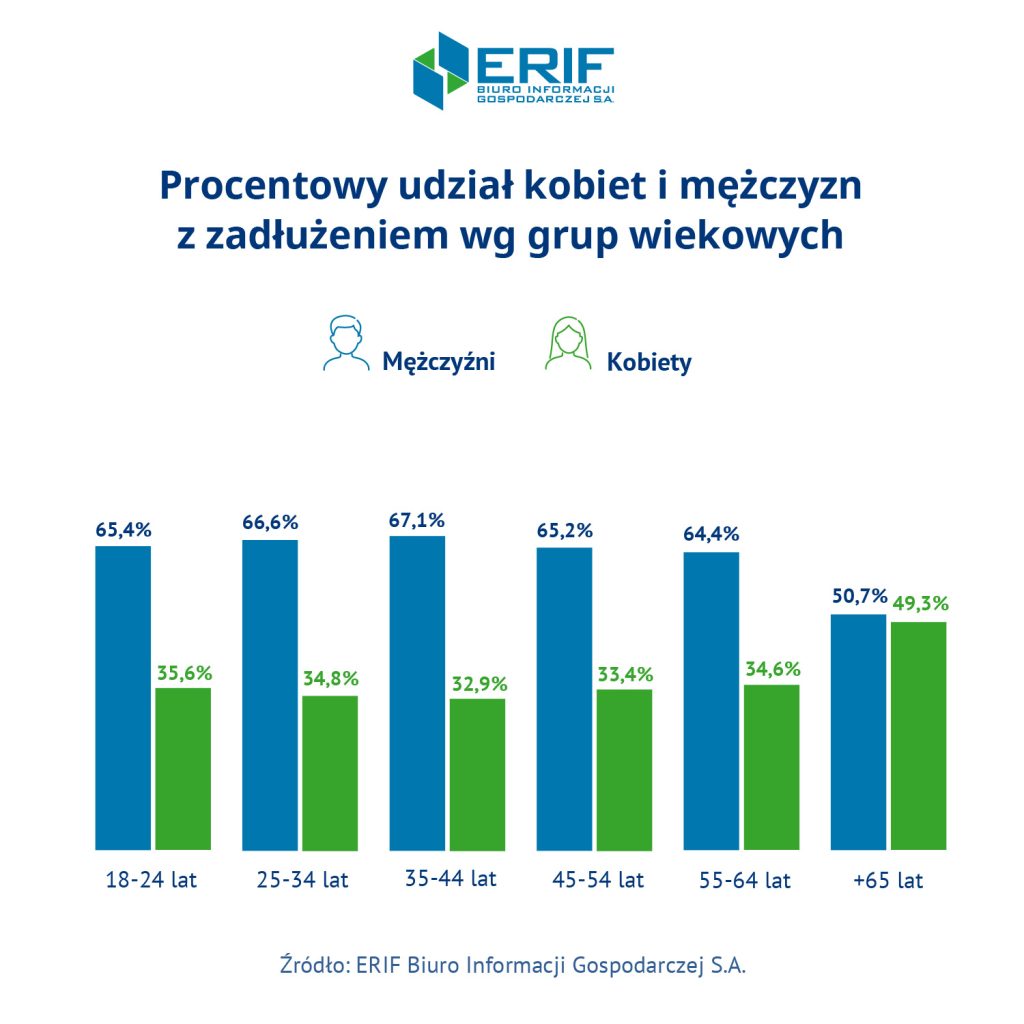 Jednocześnie udział kobiet wśród wszystkich osób zadłużonych spada. Pod koniec 2025 roku panie stanowiły 35,5 proc. wszystkich dłużników, czyli o ponad 1,5 punktu procentowego mniej niż rok wcześniej.