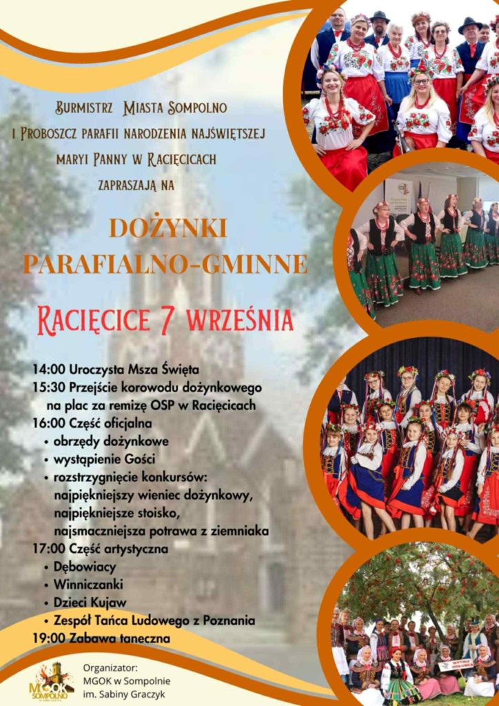 7 września w Racięcicach odbędą się Dożynki Parafialno-Gminne, czyli tradycyjne święto plonów. To wyjątkowy czas podziękowania za zebrane plony i wspólnego świętowania rolników oraz mieszkańców wsi.