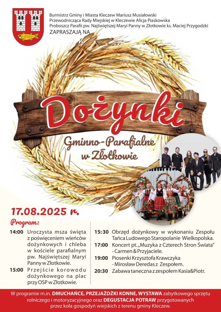 Gmina Kleczew zaprasza mieszkańców i gości na Dożynki Gminno-Parafialne, które odbędą się 17 sierpnia 2025 roku w Złotkowie. To wyjątkowa okazja, by wspólnie podziękować za tegoroczne plony, a także spędzić popołudnie i wieczór w atmosferze ludowej tradycji, muzyki i dobrej zabawy.