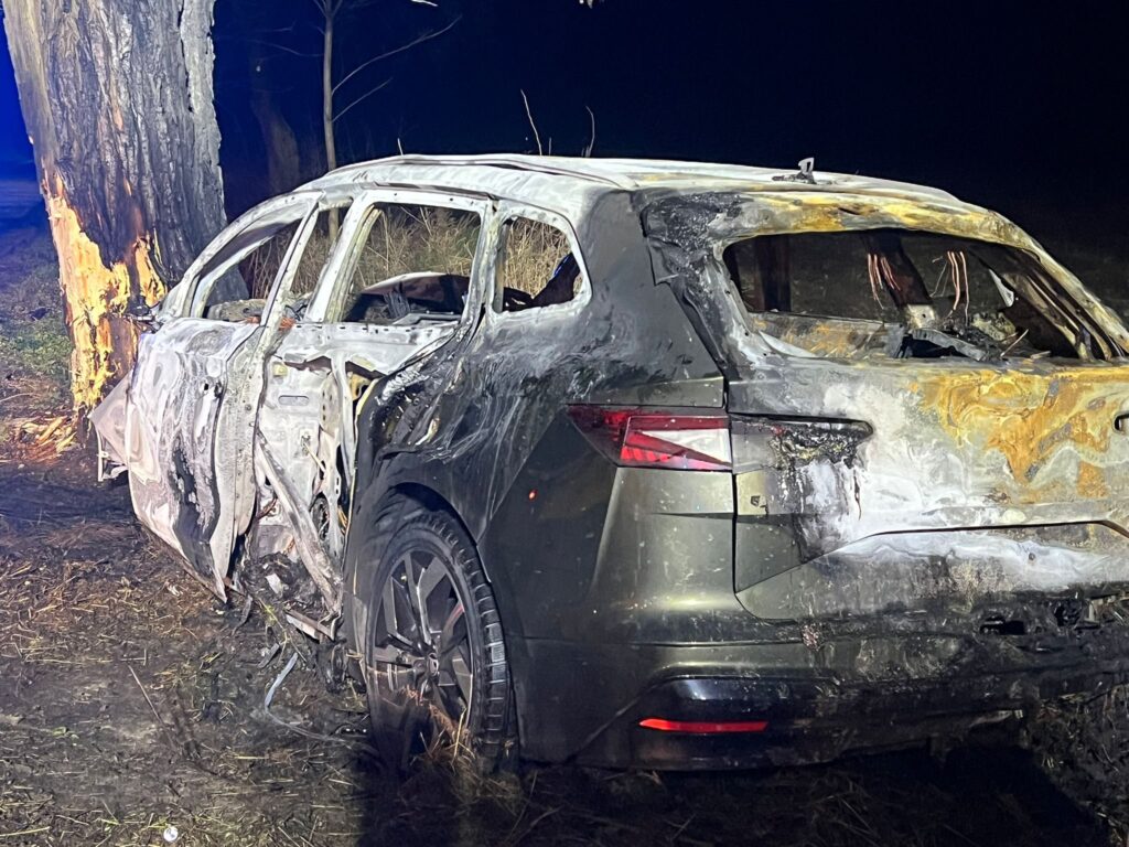 Spalony pojazd to elektryczna Skoda Enyaq. Po zderzeniu z drzewem auto natychmiast stanęło w płomieniach. Ratownicy przybyli sprawnie, jednak z uwagi na gwałtowny rozwój ognia oraz czas potrzebny na dotarcie i ugaszenie pożaru, nie udało się uratować życia kierującej. Na razie nie podano jednoznacznej przyczyny wypadku. Policja i prokuratura prowadzą oględziny i zbierają materiał dowodowy.