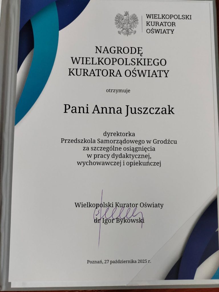 Wójt Gminy Grodziec Mariusz Piotr Woźniak poinformował, że Anna Juszczak, dyrektor Przedszkola Samorządowego w Grodźcu, została uhonorowana Nagrodą Wielkopolskiego Kuratora Oświaty. Uroczystość wręczenia nagród odbyła się w Poznaniu.