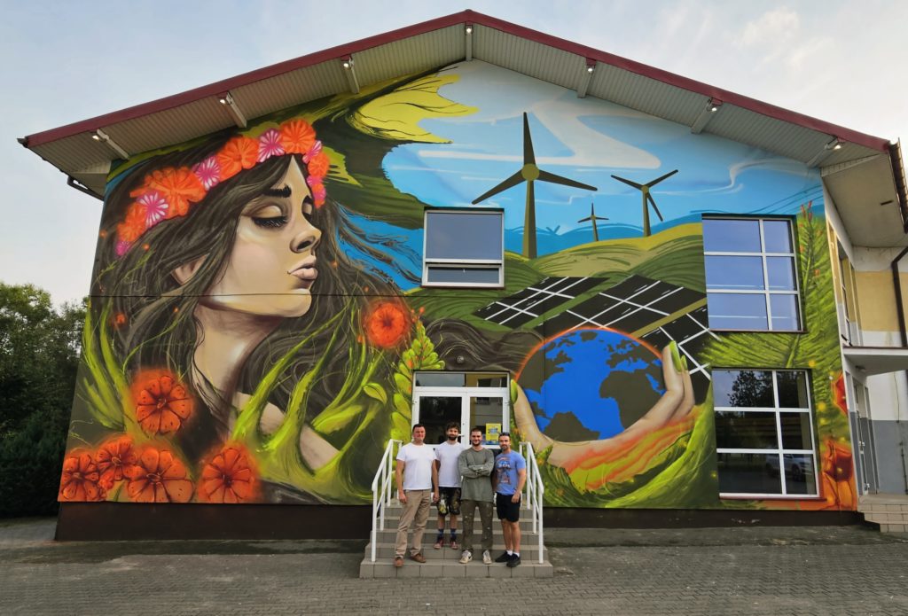 Mural na ścianie szkoły to dopiero początek projektu. W najbliższym czasie na terenie szkoły powstanie również: wiata rowerowa z zielonym dachem oraz ogrody deszczowe. Poprawiają retencję wody i wspierające lokalną bioróżnorodność. Elementy te wpłyną korzystnie zarówno na jakość powietrza, jak i gospodarkę wodną w regionie!
