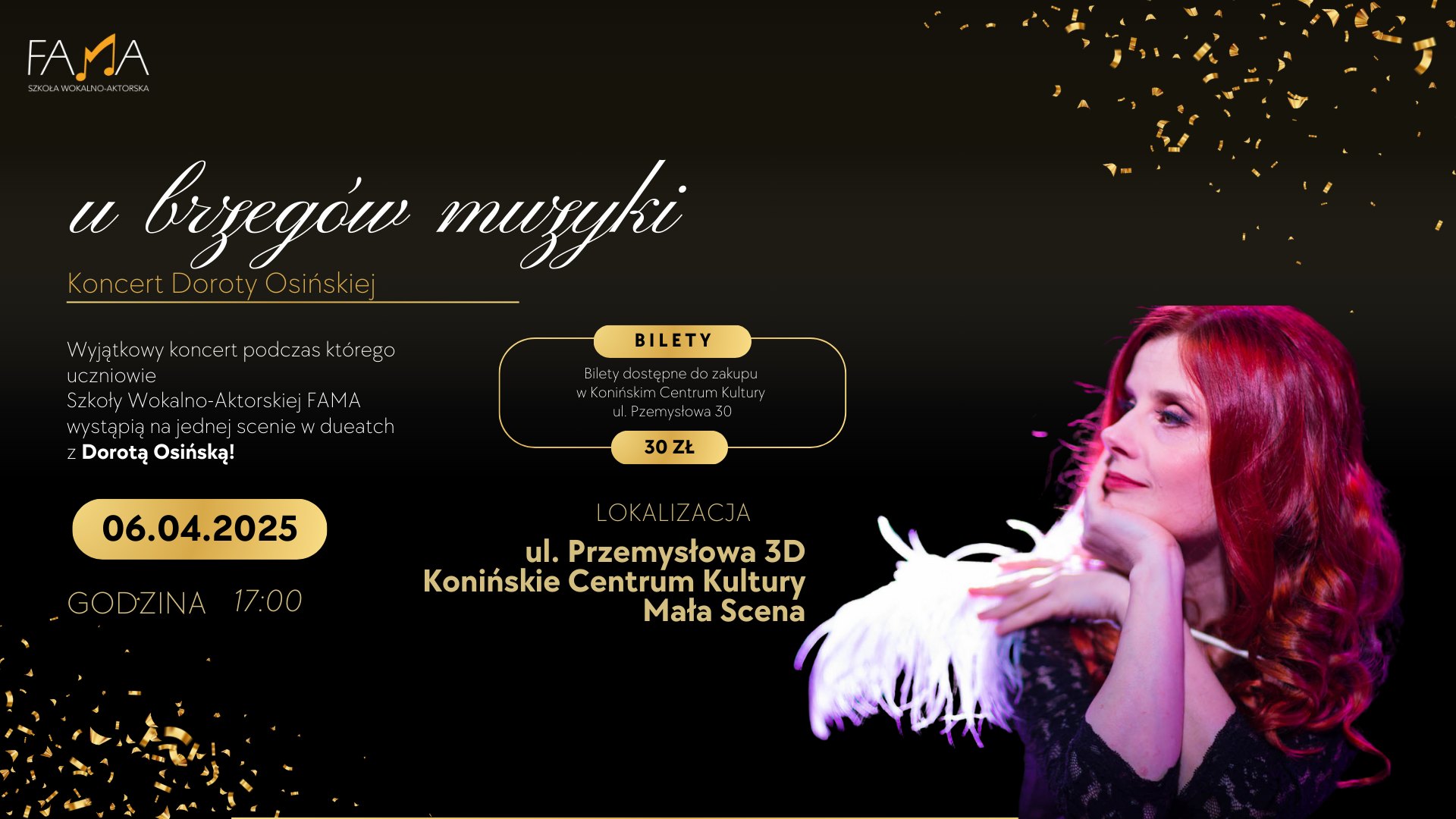 Uczniowie Szkoły Wokalno-Aktorskiej FAMA wystąpią na scenie w duetach z Dorotą Osińską, wokalistką, kompozytorką i autorką tekstów, którą widzowie zapamiętali z programu The Voice of Poland. Koncert zatytułowany „U brzegów muzyki” odbędzie się na Małej Scenie Konińskiego Centrum Kultury 6 kwietnia o godzinie 17:00.