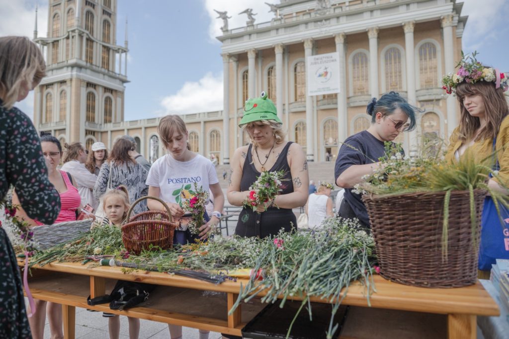 Na placu przed bazyliką stanął także namiot z wiankami, który stał się ulubionym miejscem wielu uczestniczek – młode dziewczyny z radością tworzyły kolorowe, kwieciste wianki na głowę, czerpiąc nie tylko z tradycji, ale i z potrzeby piękna, wspólnej zabawy i integracji.