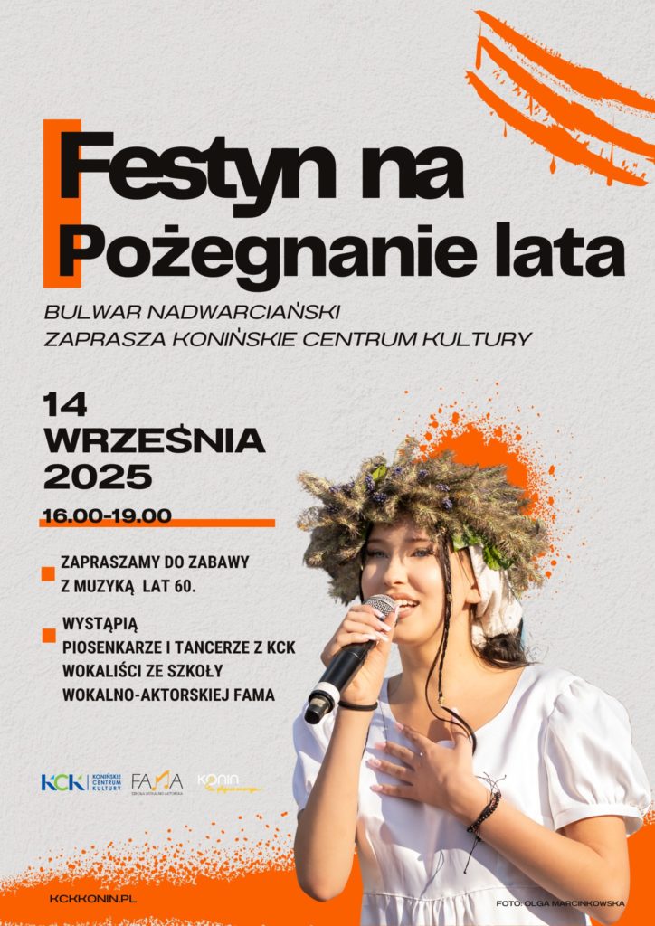 Konińskie Centrum Kultury zaprasza mieszkańców na Festiwal na pożegnanie lata, który odbędzie się w niedzielę, 14 września 2025 r., na Bulwarze Nadwarciańskim o godz. 16:00. Wydarzenie będzie okazją do wspólnego spędzenia ostatnich ciepłych dni lata przy muzyce, piosence i tańcu. Organizatorzy zachęcają do zabrania dobrego nastroju, uśmiechu oraz pozytywnej energii.