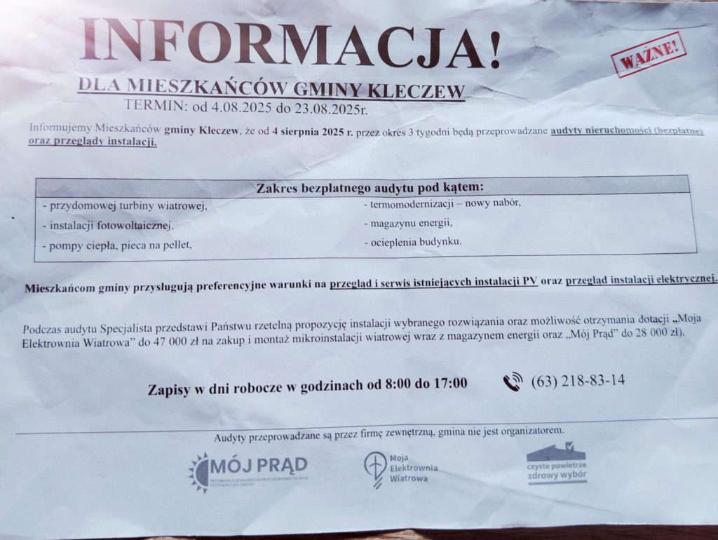 Jeżeli do Twoich drzwi trafiła podobna ulotka lub umowa do podpisu, zachowaj ostrożność i potwierdź źródło informacji. W sprawach urzędowych korzystaj wyłącznie z oficjalnych komunikatów publikowanych przez Gminę Kleczew.