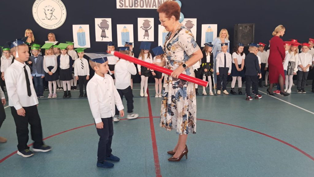 Po akcie ślubowania pani dyrektor Ewa Ignaczak dokonała uroczystego pasowania na ucznia, dotykając ramienia każdego pierwszoklasisty symbolicznym, wielkim ołówkiem. Następnie najmłodsi otrzymali pamiątkowe dyplomy oraz upominki przygotowane przez Radę Rodziców.