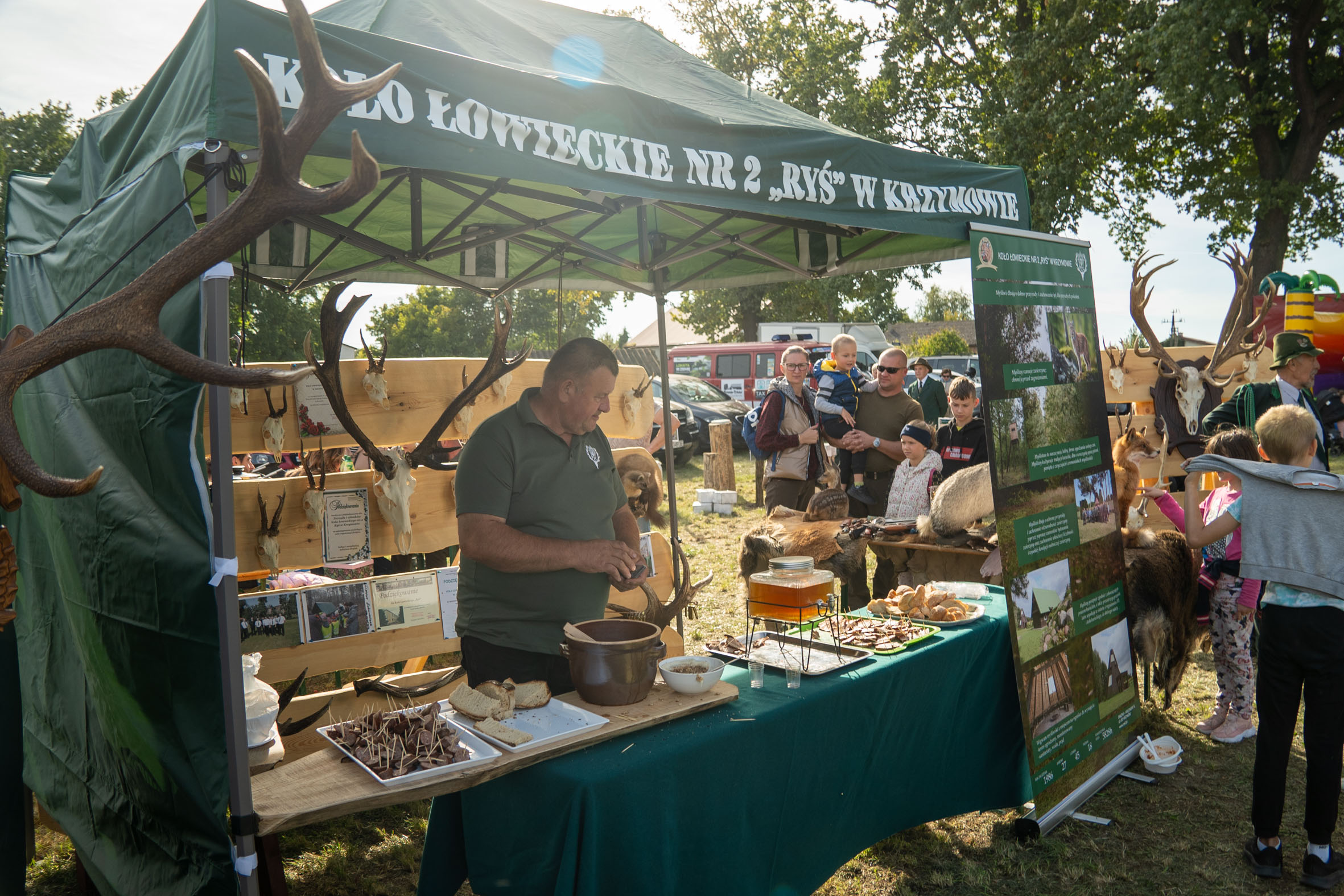 W namiotach przygotowanych przez koła łowieckie na uczestników czekały tradycyjne potrawy – żurek, gulasze, wędliny i pasztety z dziczyzny. Największe zainteresowanie wzbudziły trzy pieczone dziki serwowane z kaszą i aromatycznym sosem grzybowym.