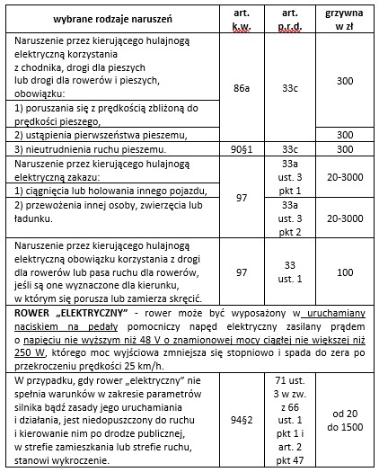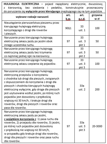 Poniżej znajduje się katalog najczęściej popełnianych wykroczeń przez użytkowników hulajnóg elektrycznych oraz wysokość mandatów.