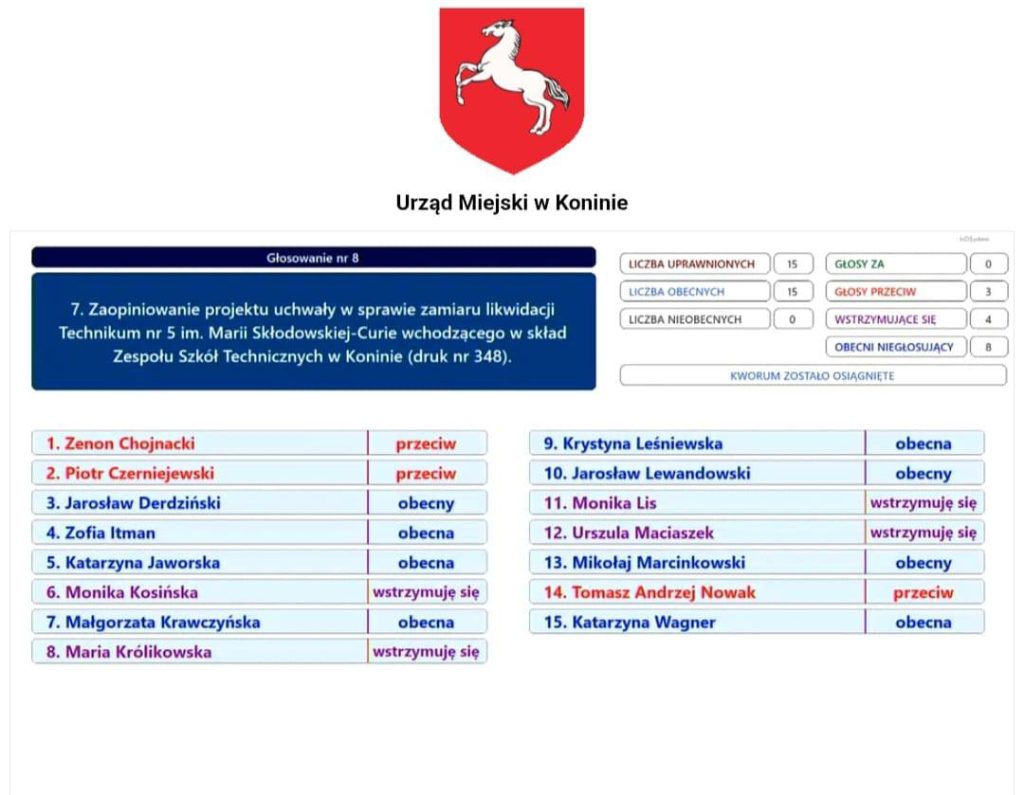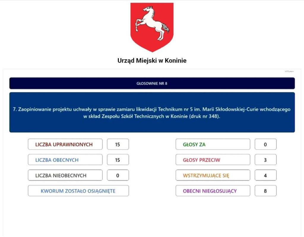 Po burzliwej dyskusji komisja dwukrotnie podjęła próbę głosowania nad projektem uchwały. Za każdym razem wynik był taki sam. Zero głosów za likwidacją, trzy przeciw i cztery wstrzymujące się. Oznacza to, że projekt nie uzyskał pozytywnej opinii komisji i na tym etapie nie został rekomendowany do dalszych prac legislacyjnych.