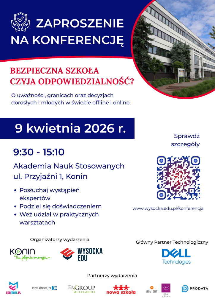 9 kwietnia w Akademii Nauk Stosowanych w Koninie odbędzie się ogólnopolska konferencja pt. „Bezpieczna szkoła – czyja odpowiedzialność?”. Wydarzenie skierowane jest do nauczycieli, dyrektorów szkół, samorządowców oraz rodziców. Dla wszystkich którzy chcą wspólnie zastanowić się nad wyzwaniami związanymi z bezpieczeństwem w edukacji. Organizatorami spotkania są Miasto Konin, Wysocka Edu – Marta Wysocka oraz Dell Technologies.