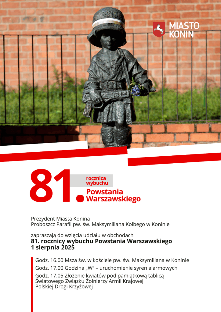 1 sierpnia – zaproszenie na obchody wybuchu Powstania Warszawskiego AktualnościKoninWydarzeniaZaproszenie 25/07/2025 Mniej niż 1 min. PROMOCJA Wydarzenia„Dzieciństwo bez przemocy” Konin włącza się w ogólnopolską kampanię.Redakcja LP - 2 godziny ago0KulturaStypendia Prezydenta Miasta Konina w dziedzinie kulturyRedakcja LP - 1 dzień ago0WydarzeniaZACHWYTNIKI 2025 – Wielkopolska pełna inspiracji!Redakcja - 20/10/20250ZdrowieNowoczesna Klinika Neurologii ICZMP – „Pomagamy Jak Umiemy” RossmannRedakcja LP - 14/10/20250AktualnościROSSMANN „MOJA DROGERIA” – NOWY WYMIAR ZAKUPÓW I BLISKOŚCIRedakcja - 10/10/20250 FacebookTwitterWhatsApp MASZ WAŻNĄ WIADOMOŚĆ? Prześlij do naszej redakcji zdjęcie, film, lub informację! +48 63 242 01 01 - Reklama - PROMOCJA Wydarzenia„Dzieciństwo bez przemocy” Konin włącza się w ogólnopolską kampanię.Redakcja LP - 2 godziny ago0KulturaStypendia Prezydenta Miasta Konina w dziedzinie kulturyRedakcja LP - 1 dzień ago0WydarzeniaZACHWYTNIKI 2025 – Wielkopolska pełna inspiracji!Redakcja - 20/10/20250ZdrowieNowoczesna Klinika Neurologii ICZMP – „Pomagamy Jak Umiemy” RossmannRedakcja LP - 14/10/20250AktualnościROSSMANN „MOJA DROGERIA” – NOWY WYMIAR ZAKUPÓW I BLISKOŚCIRedakcja - 10/10/20250 TagiGodzina WMsza ŚwiętaobchodyPowstanie Warszawskiezaproszenie Redakcjahttps://konin24.info Szukaj Konin zachmurzenie duże enter location 13.2 ° C 13.2 ° 13.2 ° 66 % 4.7kmh 100 % śr. 12 ° czw. 12 ° pt. 11 ° sob. 13 ° niedz. 13 ° Sygnał24INFO Zmiana organizacji ruchu przy cmentarzu w Sompolnie – 1 listopada 29/10/2025 Policjanci z Konina zabezpieczyli nielegalny tytoń i papierosy bez polskich znaków akcyzy 29/10/2025 Wyłączenie sygnalizacji świetlnej na skrzyżowaniu Przemysłowa – Paderewskiego w Koninie 29/10/2025 Uwaga! Fałszywi ankieterzy w gminie Kramsk – ważny komunikat dla mieszkańców 28/10/2025 Tymczasowa zmiana organizacji ruchu w Wilczogórze 28/10/2025 Poprzedni artykułMIĘDZYNARODOWA WYMIANA MŁODZIEŻY – POLSKO-NIEMIECKI PROJEKT Z UDZIAŁEM UCZNIÓW Z GOLINYNastępny artykułTRADYCJA, KTÓRA ŁĄCZY – WARSZTATY Z LIDIĄ MAKSYM W KONINIE Mogłeś przegapić Bezpłatna lekcja tańca towarzyskiego w Koninie – Zbigniew Witkowiak Zaproszenie 29/10/2025 Duże zainteresowanie pracą w nowym żłobku w Brzeźnie Krzymów 29/10/2025 Erasmus Days w Zespole Szkół im. Mikołaja Kopernika w Koninie Aktualności 29/10/2025