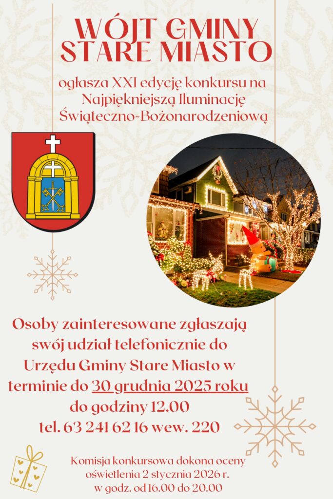 Gmina Stare Miasto po raz kolejny zaprasza mieszkańców do udziału w jednym z najbardziej klimatycznych wydarzeń końcówki roku – Konkursie na Najpiękniejszą Iluminację Świąteczno-Bożonarodzeniową. To inicjatywa, która od lat łączy lokalną społeczność, zachęca do twórczej rywalizacji i wspólnego budowania wyjątkowej atmosfery w te święta. Tegoroczna edycja ma wyjątkowy charakter – konkurs odbędzie się już po raz 21.