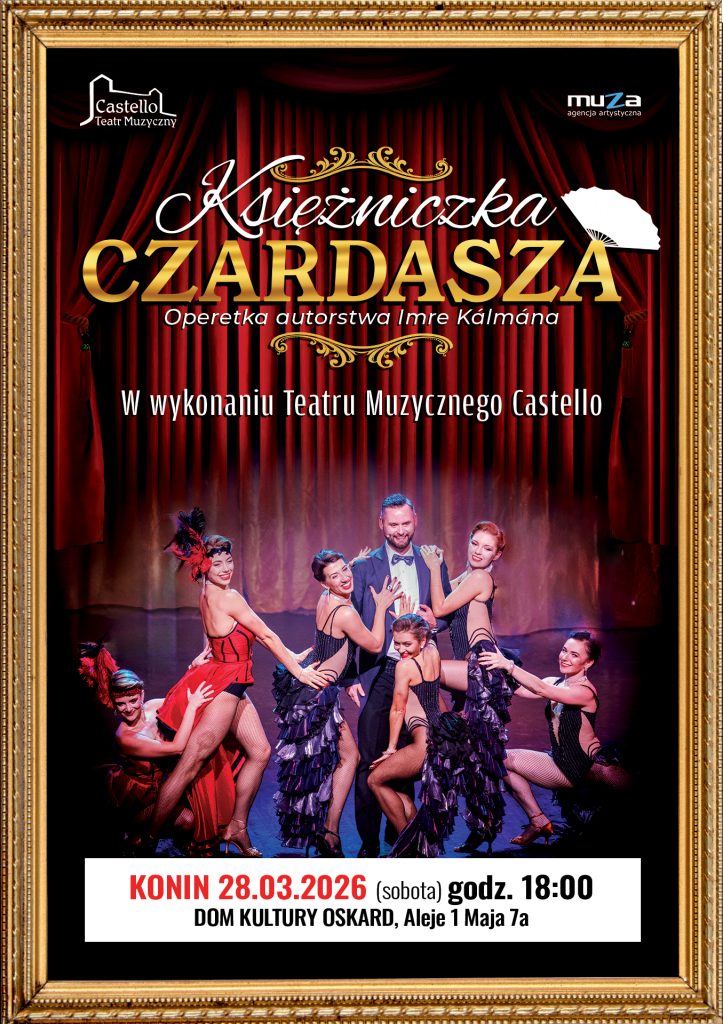 Jedna z najsłynniejszych operetek w historii muzyki scenicznej zagości w Koninie. „Księżniczka Czardasza” w wykonaniu Teatru Muzycznego Castello zostanie zaprezentowana 28 marca 2026 roku o godz. 18:00 w Domu Kultury Oskard.