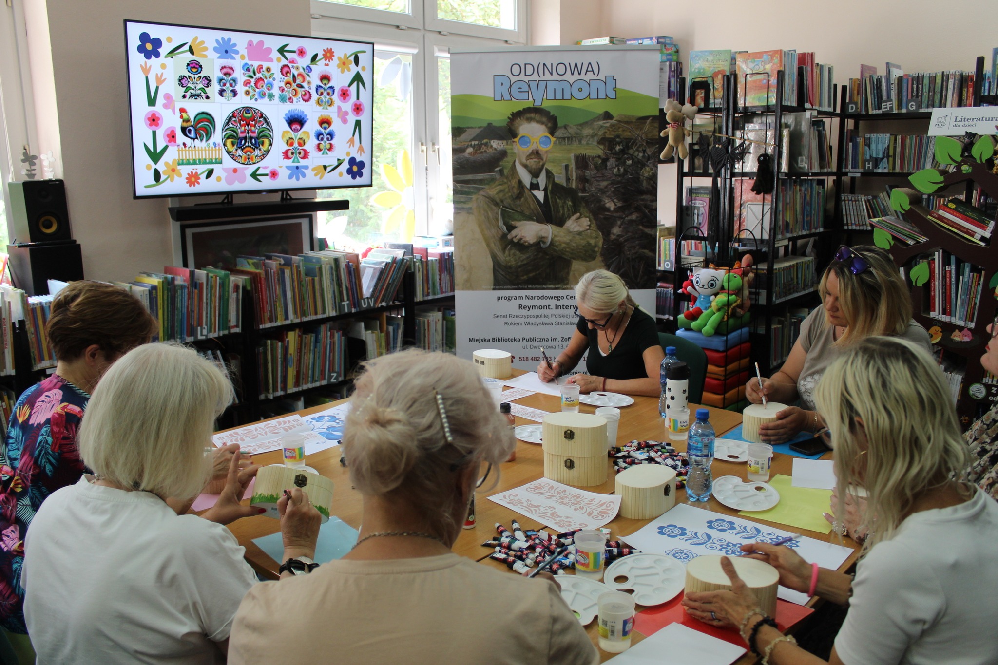 Zajęcia rozpoczęły się od wprowadzenia prezentacyjnego, które przybliżyło tematykę twórczości Reymonta, w szczególności jego związek z ludowością i kulturą wiejską. Uczestniczki warsztatów – głównie panie – tworzyły autorskie kompozycje przy użyciu farb akrylowych, dekorując niewielkie drewniane skrzynki. Wzory ludowe i omówione podczas prezentacji motywy posłużyły jako inspiracja do rozwijania indywidualnej kreatywności i wrażliwości plastycznej.