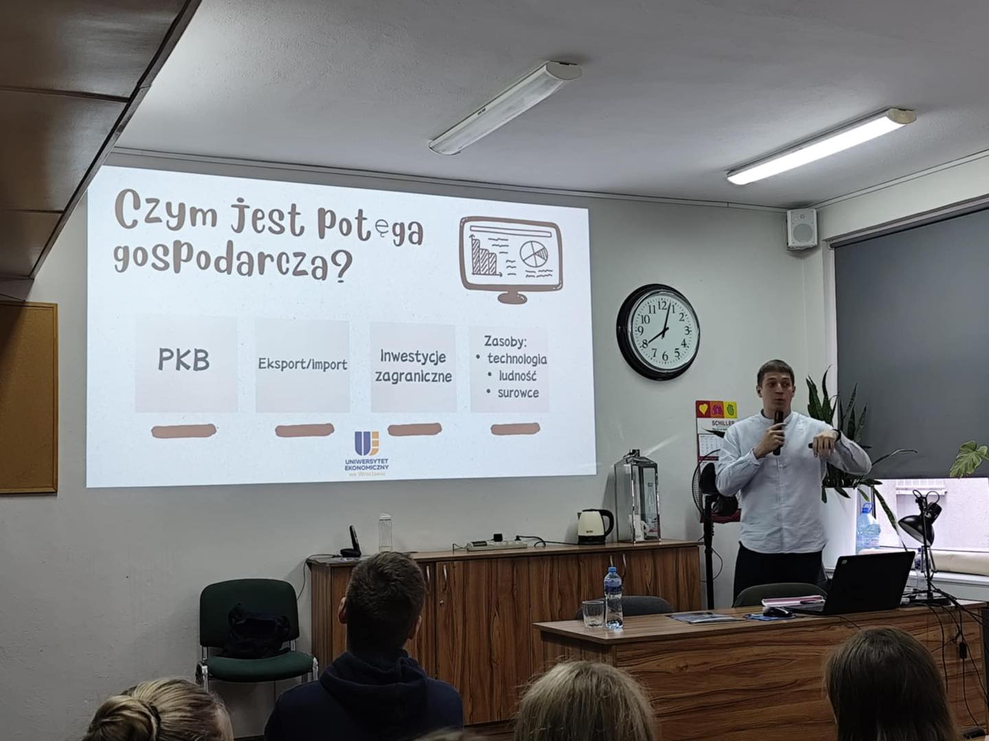 Wykłady poprowadzili eksperci z różnych dziedzin: pan Wiktor Walczak z Uniwersytetu Ekonomicznego we Wrocławiu przybliżył temat rywalizacji gospodarczej pomiędzy USA, Chinami i Unią Europejską, natomiast pani Karina Grzywacz z Urzędu Miasta Konin podzieliła się wiedzą na temat zakładania własnej firmy i rozwoju przedsiębiorczości.