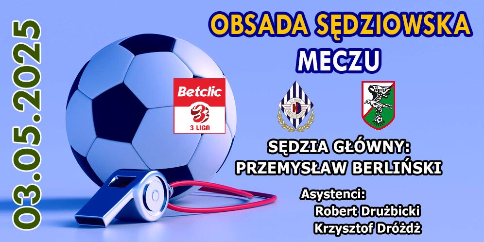 Polski Związek Piłki Nożnej ogłosił obsadę sędziowską na 28. kolejkę Betclic 3. Ligi. Starcie pomiędzy Pogonią Nowe Skalmierzyce a Sokołem Kleczew poprowadzi Przemysław Berliński z Sieradza, reprezentujący Kolegium Sędziów Łódzkiego ZPN.