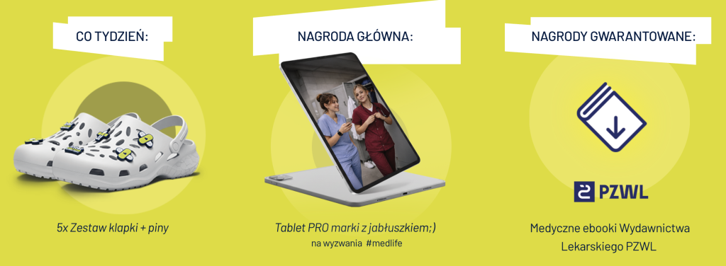 Autorzy najciekawszych propozycji mogą liczyć na atrakcyjne nagrody rzeczowe. Wśród nich znalazły się między innymi: tablet, klapki z zestawem przypinek, e-booki medyczne, kody zniżkowe od Wydawnictwa Lekarskiego PZWL.