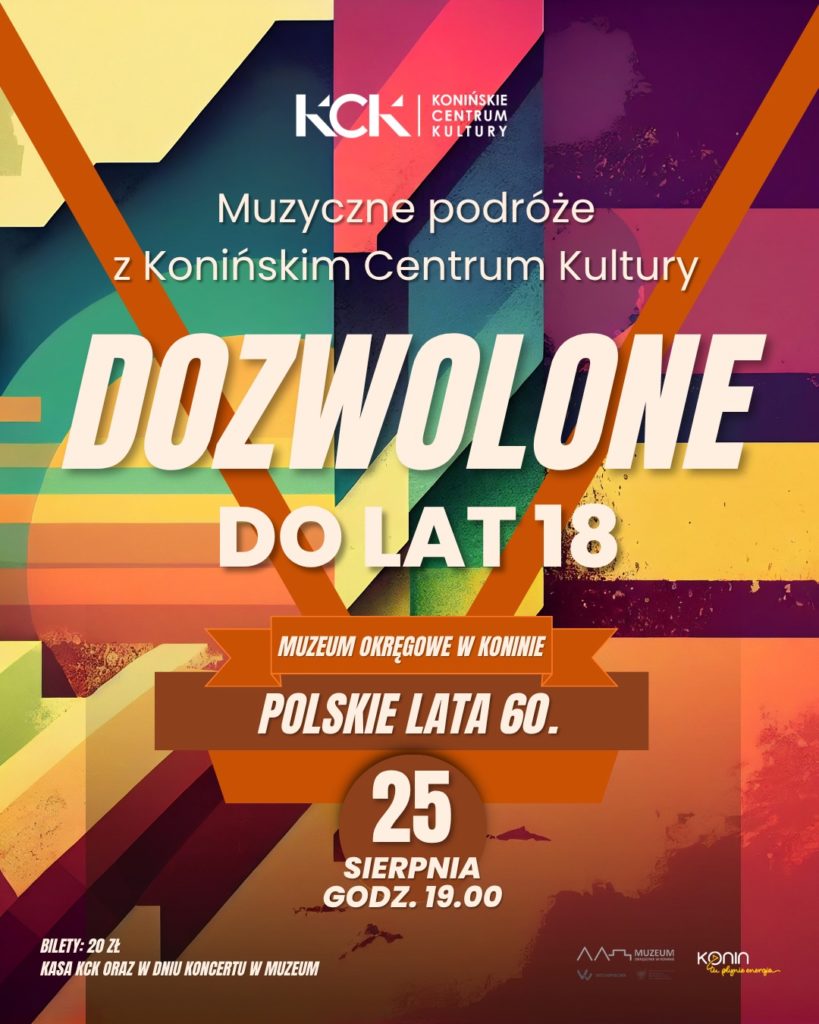 Konińskie Centrum Kultury zaprasza na wyjątkowy koncert z cyklu „Muzyczne podróże z KCK”, który tym razem przeniesie słuchaczy w barwne lata 60. Wydarzenie zatytułowane „Dozwolone do lat 18” odbędzie się 25 sierpnia o godz. 19.00 w Muzeum Okręgowym w Koninie.