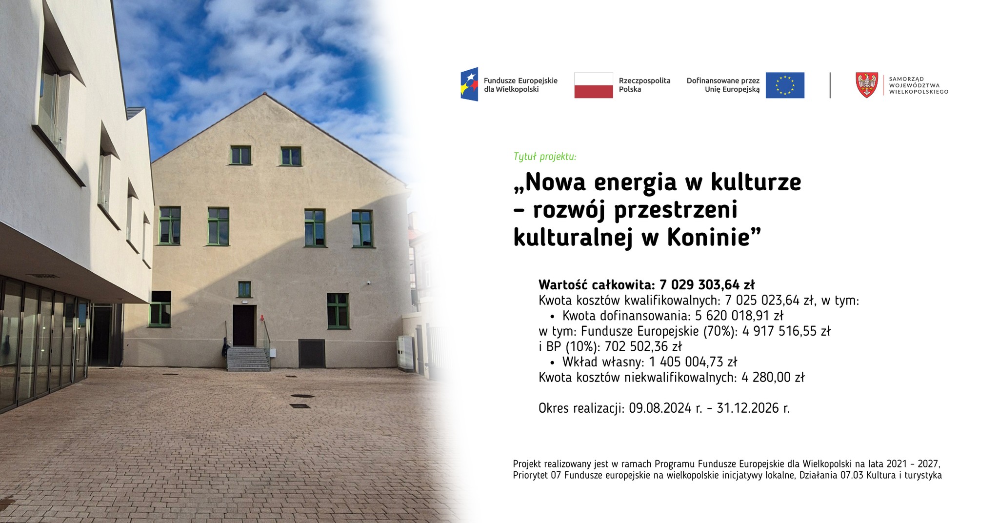 Miasto Konin realizuje projekt „Nowa energia w kulturze – rozwój przestrzeni kulturalnej w Koninie” w ramach Programu Fundusze Europejskie dla Wielkopolski na lata 2021–2027, Priorytet 07 Fundusze europejskie na wielkopolskie inicjatywy lokalne, Działanie 07.03 Kultura i turystyka. Projekt ma na celu aktywizację kulturalną zabytkowej Starówki oraz wsparcie zintegrowanego rozwoju społecznego, gospodarczego i środowiskowego miasta poprzez rozwój kultury, dziedzictwa, turystyki i bezpieczeństwa.
