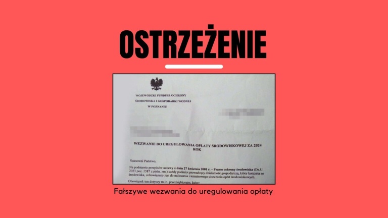Wojewódzki Fundusz Ochrony Środowiska i Gospodarki Wodnej w Poznaniu przestrzega przed oszustami, którzy wysyłają fałszywe pisma dotyczące uregulowania opłaty środowiskowej za 2024 rok.