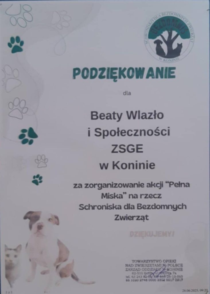 Zakończyła się XVII edycja akcji charytatywnej „Pełna miska”, organizowanej przez społeczność Zespołu Szkół Górniczo-Energetycznych w Koninie na rzecz bezdomnych psów i kotów ze Schroniska dla Zwierząt. Tegoroczna edycja, trwająca od kwietnia do czerwca 2025 roku, po raz kolejny zakończyła się sukcesem.