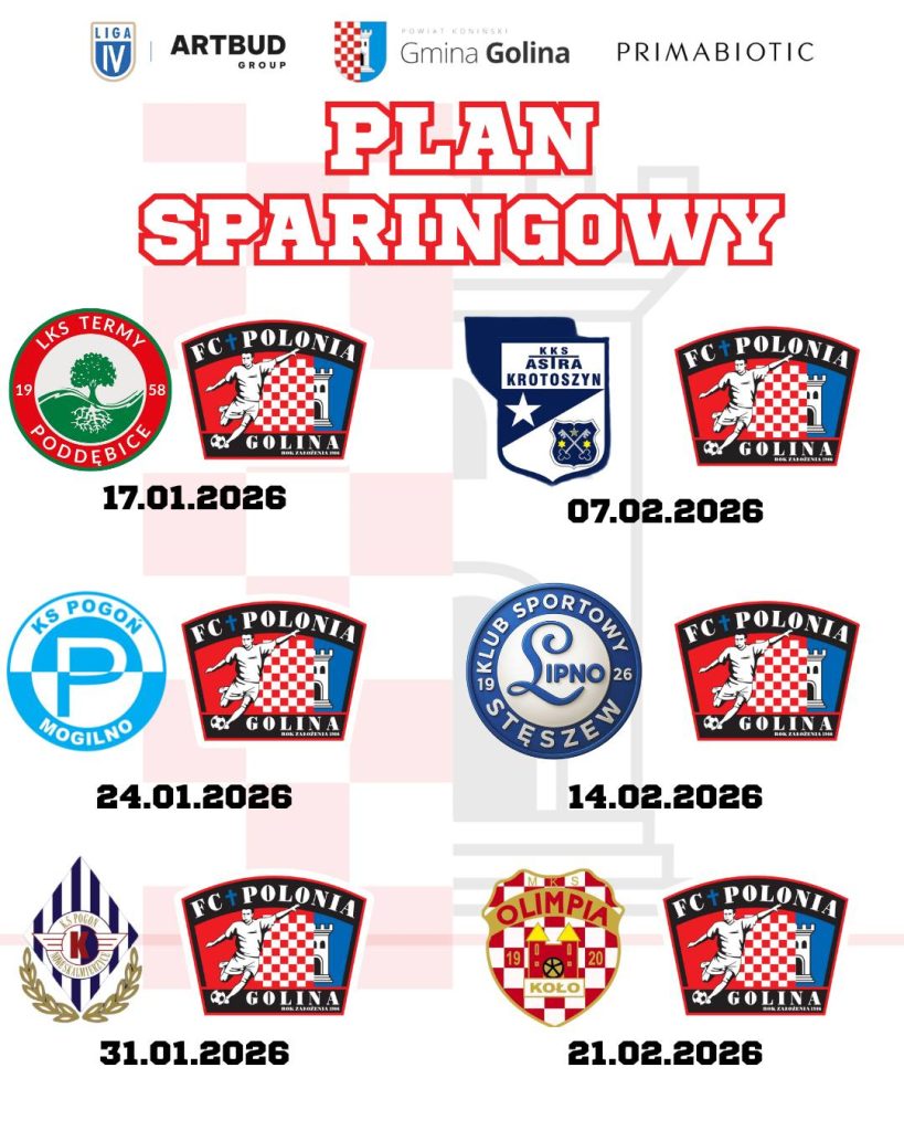 Najwyżej notowana w tym zestawieniu Polonia Golina (Artbud IV Liga) postawiła na bardzo wymagający grafik. Podopieczni trenera Przemysława Skibiszewskiego rozpoczną serię spotkań już 17 stycznia starciem z Termami Poddębice. W kolejnych tygodniach zawodnicy z Goliny zmierzą się z takimi markami jak Pogoń Mogilno (24.01), KS Pogoń Nowe Skalmierzyce (31.01), KKS Astra Krotoszyn (07.02) czy Lipno Stęszew (14.02). Cykl przygotowań zakończy pojedynek z Olimpią Koło, zaplanowany na 21 lutego.