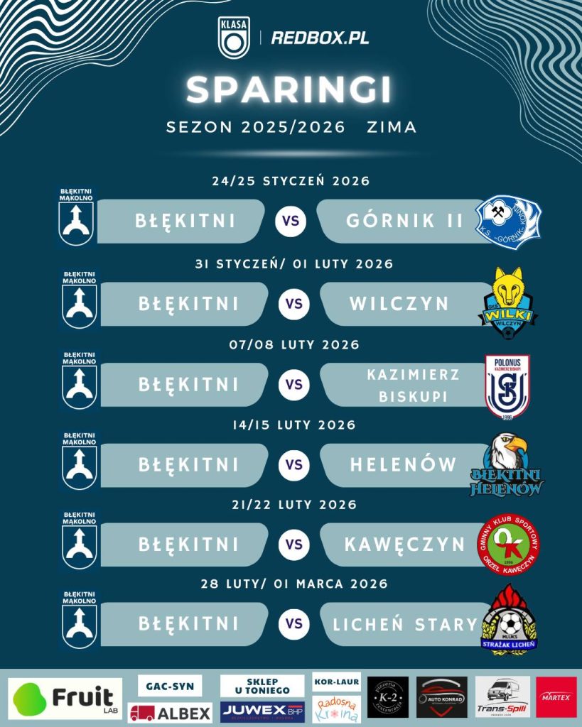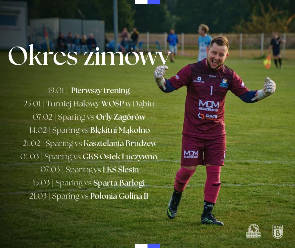 Błękitni Mąkolno rozpoczną okres przygotowawczy od sparingu z rezerwami Górnika Konin. Drużyna zaplanowała także serię spotkań z zespołami z regionu, w tym m.in. z Wilczynem oraz Strażakiem Licheń Stary.