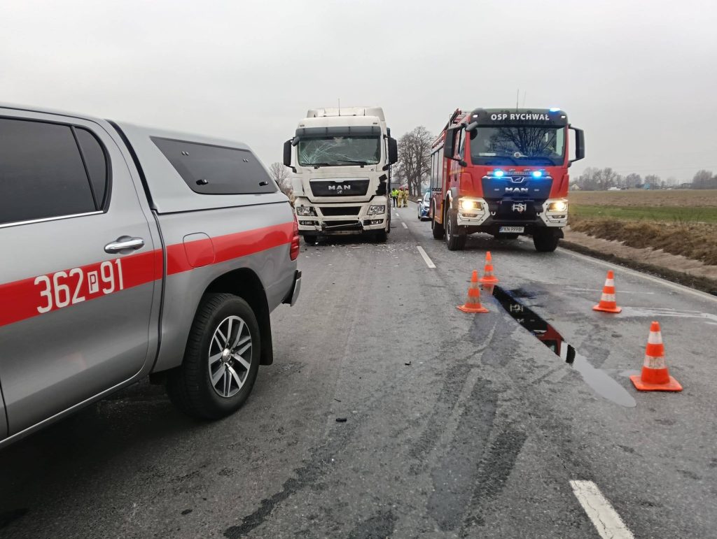 Około godziny 14 w piątek lokalne służby otrzymały zgłoszenie o poważnym zdarzeniu drogowym na drodze krajowej nr 25 w Rychwale. Według wstępnych informacji, na odcinku trasy między Koninem a Kaliszem doszło do zderzenia samochodu ciężarowego z busem i autem osobowym. Pojazdem przewożonych było 10 dzieci. Troje z nich zostało przetransportowanych do szpitala na badania. Policja oraz zespoły ratownictwa medycznego ustalają szczegóły zdarzenia.