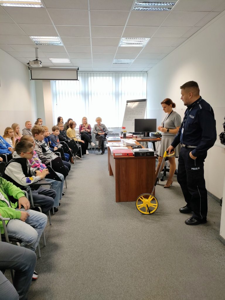Uczniów oprowadziła asp. Maria Baranowska, oficer biura prasowego Komendanta Miejskiego Policji w Koninie, która w ciekawy sposób opowiedziała o obowiązkach funkcjonariuszy i znaczeniu pracy zespołowej. Młodzież odwiedziła Wydział Ruchu Drogowego, gdzie poznała wyposażenie policjanta i specyfikę pracy w terenie.