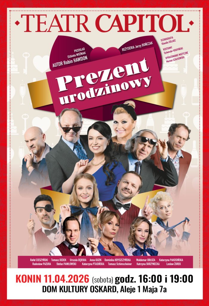 Spektakl „Prezent urodzinowy” zostanie zaprezentowany w Koninie w sobotę 11 kwietnia 2026 roku. Ze względu na duże zainteresowanie zaplanowano dwa przedstawienia tego samego dnia.