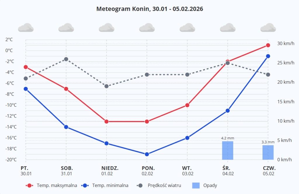 Nadchodzące dni w naszym regionie upłyną pod znakiem ekstremalnych temperatur, które przypomną nam o surowym obliczu zimy. Analiza najnowszego meteogramu wskazuje, że po stosunkowo łagodnym piątku, Konin czeka gwałtowne uderzenie mrozu. Swoje apogeum osiągnie na przełomie stycznia i lutego. Mieszkańcy powinni przygotować się na warunki, w których temperatura minimalna może spaść do bardzo niskich poziomów.