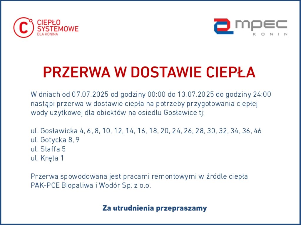 Przerwa w dostawie ciepła w Koninie – ważny komunikat MPEC! Sygnał 24 01/07/2025 Mniej niż 1 min. PROMOCJA KulturaStypendia Prezydenta Miasta Konina w dziedzinie kulturyRedakcja LP - 1 dzień ago0WydarzeniaZACHWYTNIKI 2025 – Wielkopolska pełna inspiracji!Redakcja - 20/10/20250ZdrowieNowoczesna Klinika Neurologii ICZMP – „Pomagamy Jak Umiemy” RossmannRedakcja LP - 14/10/20250AktualnościROSSMANN „MOJA DROGERIA” – NOWY WYMIAR ZAKUPÓW I BLISKOŚCIRedakcja - 10/10/20250AktualnościNoc Zawodowców 2025 w Kole – młodzież odkrywała zawody przyszłościRedakcja LP - 06/10/20250 FacebookTwitterWhatsApp MASZ WAŻNĄ WIADOMOŚĆ? Prześlij do naszej redakcji zdjęcie, film, lub informację! +48 63 242 01 01 - Reklama - PROMOCJA KulturaStypendia Prezydenta Miasta Konina w dziedzinie kulturyRedakcja LP - 1 dzień ago0WydarzeniaZACHWYTNIKI 2025 – Wielkopolska pełna inspiracji!Redakcja - 20/10/20250ZdrowieNowoczesna Klinika Neurologii ICZMP – „Pomagamy Jak Umiemy” RossmannRedakcja LP - 14/10/20250AktualnościROSSMANN „MOJA DROGERIA” – NOWY WYMIAR ZAKUPÓW I BLISKOŚCIRedakcja - 10/10/20250AktualnościNoc Zawodowców 2025 w Kole – młodzież odkrywała zawody przyszłościRedakcja LP - 06/10/20250 TagiDostawa ciepłaGosławiceKoninMPECPrzerwautrudnienia Redakcjahttps://konin24.info Szukaj Konin zachmurzenie umiarkowane enter location 12.7 ° C 12.7 ° 12.7 ° 72 % 7kmh 67 % śr. 13 ° czw. 12 ° pt. 11 ° sob. 14 ° niedz. 14 ° Sygnał24INFO Wyłączenie sygnalizacji świetlnej na skrzyżowaniu Przemysłowa – Paderewskiego w Koninie 29/10/2025 Uwaga! Fałszywi ankieterzy w gminie Kramsk – ważny komunikat dla mieszkańców 28/10/2025 Tymczasowa zmiana organizacji ruchu w Wilczogórze 28/10/2025 Urząd Miejski w Golinie będzie nieczynny 10 listopada 28/10/2025 Dewastował kosz na śmieci – interweniowała Straż Miejska w Koninie 28/10/2025 Poprzedni artykułPunkt sprzedaży biletów MZK – zmiana godzin otwarciaNastępny artykułKonin gospodarzem X Seminarium TPOK – rozmowy o innowacjach i transformacji energetycznej Mogłeś przegapić Wyłączenie sygnalizacji świetlnej na skrzyżowaniu Przemysłowa – Paderewskiego w Koninie Sygnał 24 29/10/2025 Uwaga! Fałszywi ankieterzy w gminie Kramsk – ważny komunikat dla mieszkańców Kramsk 28/10/2025 Tymczasowa zmiana organizacji ruchu w Wilczogórze Wilczyn 28/10/2025