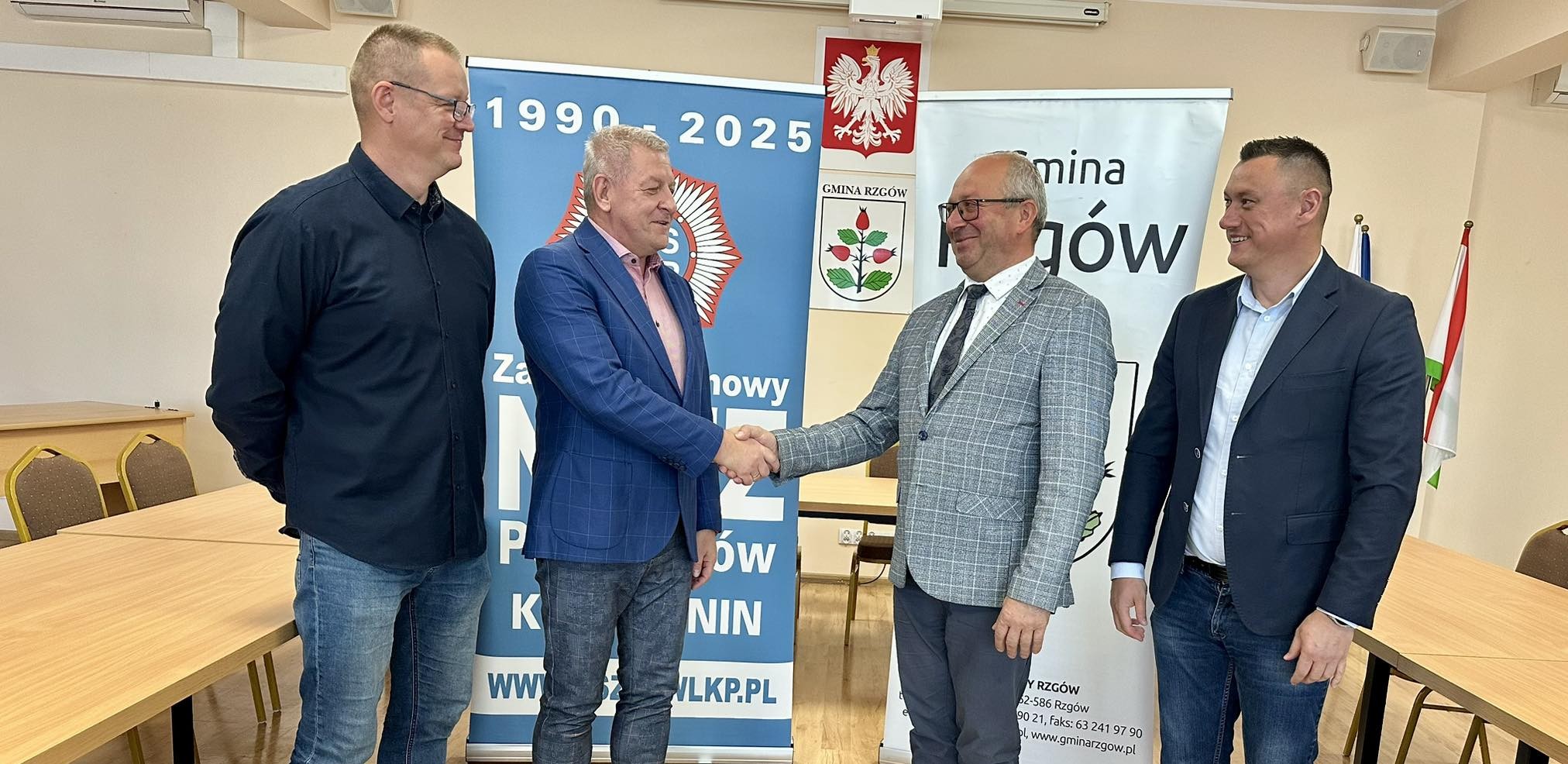 Wspólna fotografia z uściskiem dłoni wójta Rzgowa i mł. insp. Szarego symbolizuje dobre relacje oraz zaangażowanie w realizację tego sportowego przedsięwzięcia.