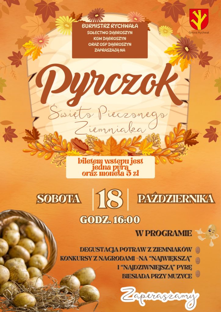 Burmistrz Rychwała, Sołectwo Dąbroszyn, Koło Gospodyń Wiejskich w Dąbroszynie oraz Ochotnicza Straż Pożarna w Dąbroszynie zapraszają wszystkich mieszkańców na wyjątkowe, jesienne wydarzenie – Pyrczok – Święto Pieczonego Ziemniaka.
