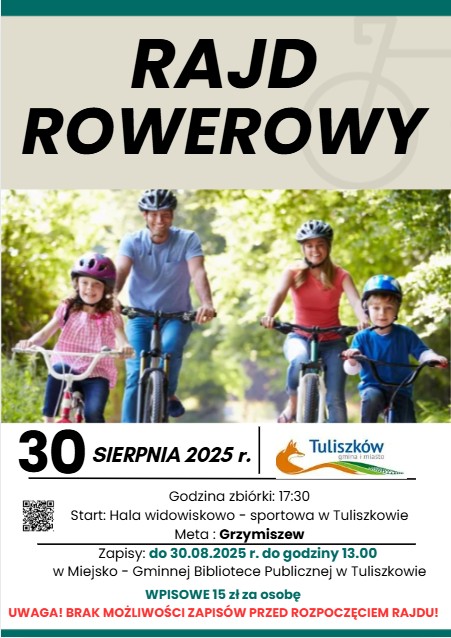 Zapisy prowadzone są do 30 sierpnia do godziny 13:00 w Miejsko-Gminnej Bibliotece Publicznej w Tuliszkowie. Organizatorzy przypominają, że nie ma możliwości zapisów bezpośrednio przed startem rajdu. To doskonała okazja, aby spędzić aktywnie ostatnią sobotę wakacji i cieszyć się rowerową przygodą wraz z innymi pasjonatami dwóch kółek.