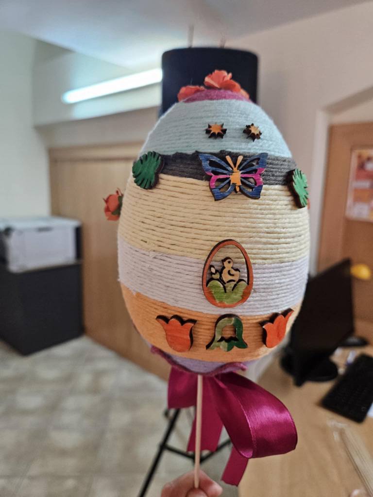 Podczas zajęć uczestnicy poznawali tajniki batikowej metody zdobienia pisanek. Praca z gorącym woskiem pszczelim i barwnikami pozwalała na uzyskanie wielowarstwowych, kolorowych wzorów, które – choć czasochłonne – dawały efekt unikalnej dekoracji. Nie mniejszym zainteresowaniem cieszyły się oklejanki, do których wykorzystywano kolorowe sznurki, klej i różnorodne ozdobne detale. Powstałe prace cechowała różnorodność, pomysłowość i estetyka – wiele z nich z pewnością stanie się świąteczną ozdobą wielkanocnych stołów.