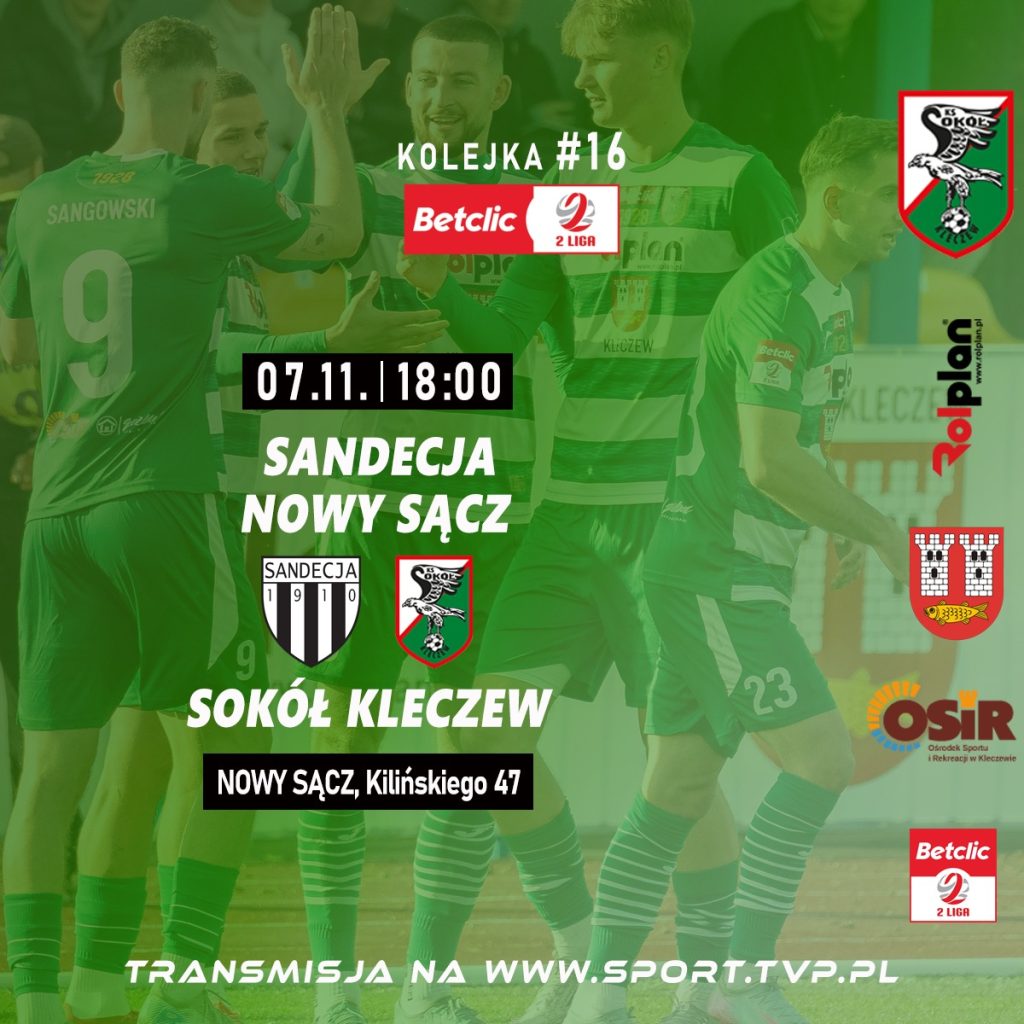 Spotkanie Sandecja Nowy Sącz – Sokół Kleczew odbędzie się 7 listopada o godz. 18:00 na Stadionie im. Ojca Władysława Augustynka przy ul. Kilińskiego 47 w Nowym Sączu. Transmisję będzie można obejrzeć na www.sport.tvp.pl.
