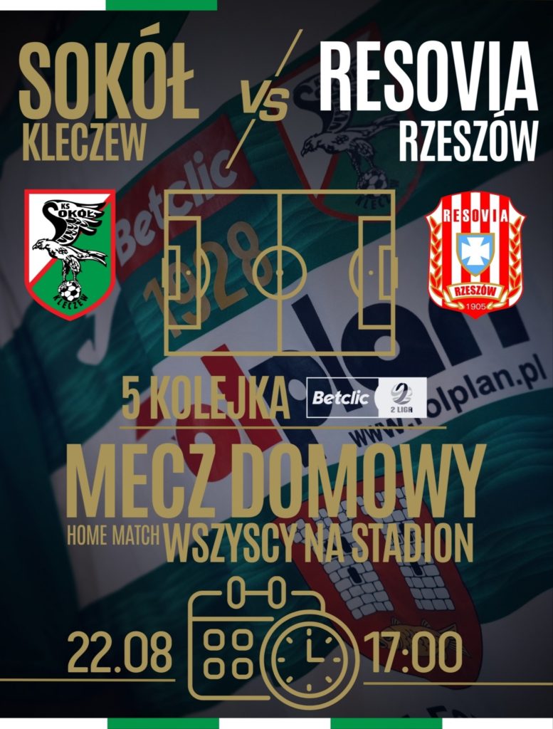 Na stadionie przy ulicy Aleje 600-lecia w Kleczewie odbędzie się niezwykle emocjonujące spotkanie 5. kolejki BETCLIC 2 Ligi. Sokół Kleczew zmierzy się z jednym z głównych faworytów rozgrywek – Resovią Rzeszów, która celuje w awans do 1. ligi.
