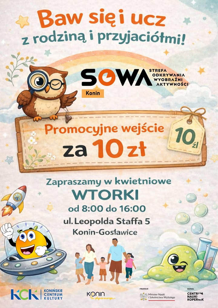 Strefa Odkrywania Wyobraźni Aktywności SOWA Konin przygotowała na kwiecień wyjątkową ofertę dla mieszkańców regionu! Dzięki różnorodnym wydarzeniom, warsztatom oraz promocyjnym wejściom każdy (zarówno dzieci, jak i dorośli) znajdzie coś dla siebie. Co więcej, wszystkie atrakcje odbywają się w nowoczesnej przestrzeni edukacyjnej w Gosławicach, która łączy naukę z zabawą.